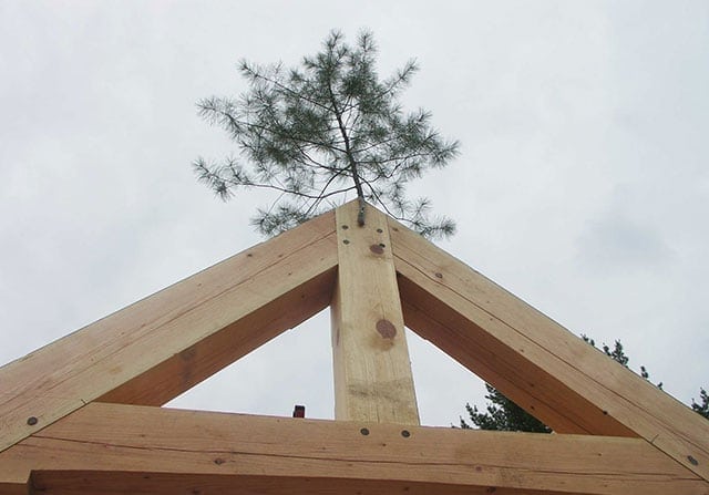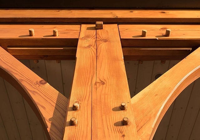 Oak is a dense hardwood that has been used in traditional timber frame homes for centuries. Its sheer strength enables builders to create more delicate connections. Additionally, many clients are looking for the character imparted by the knots and grain-figuring of oak.