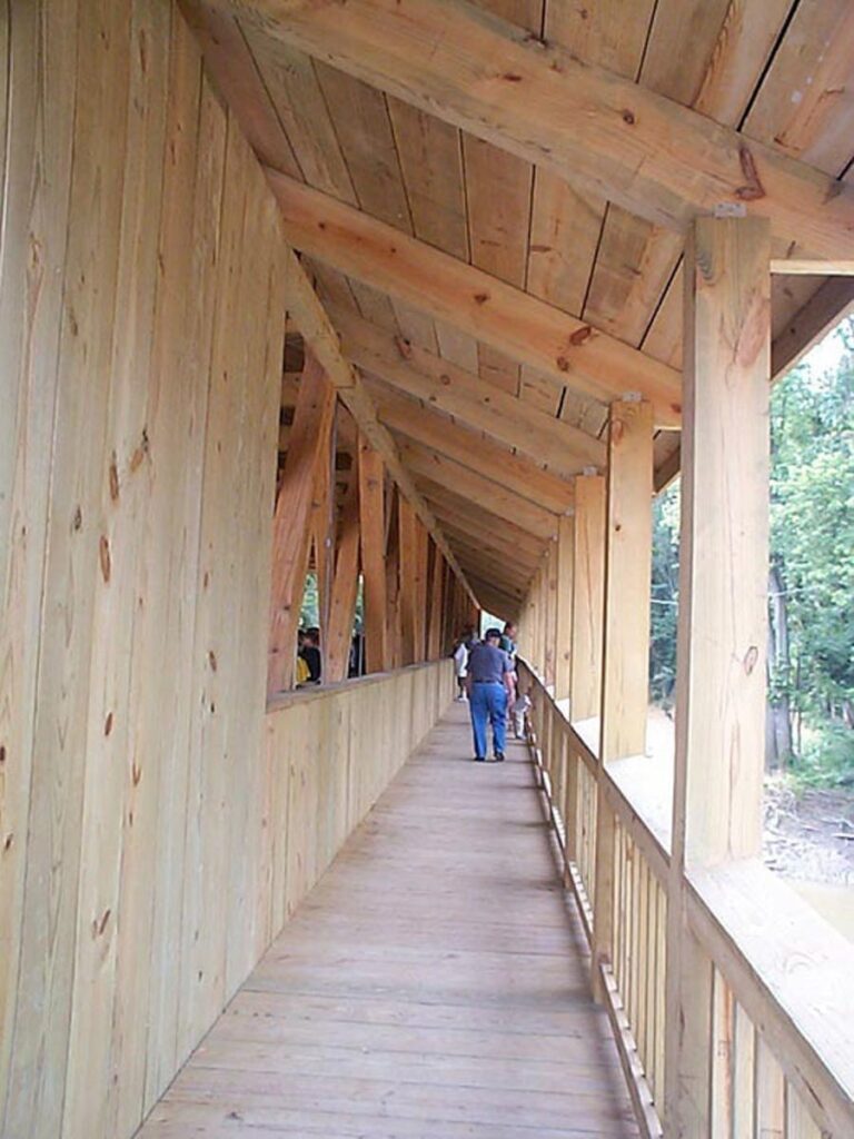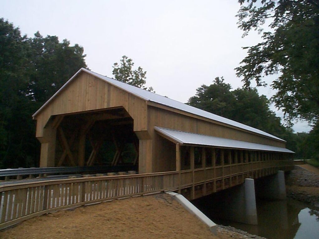 Everyone notices when they’re driving by an impressive bridge. This is particularly true when it comes to a timber frame bridge. Timber framing holds the distinction of being structural, historic, and beautiful. These attributes are part of the reason why so many communities continue to build and rebuild covered bridges in their towns using traditional timber framing methods. If you’re interested in adding something unique to your local bridge, or rebuilding a bridge that already holds a special place in your heart, please contact us to learn how we can help. Below, you’ll find a gallery showcasing several of our past bridge-building projects.