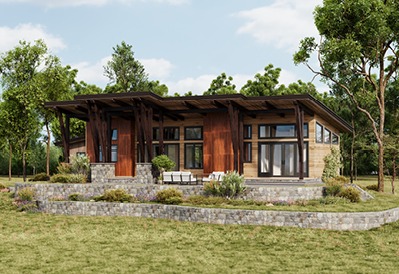 You’ll see recurring elements throughout these modern timber frame homes, such as large windows and natural textures, like stone and wood facades. Despite these shared elements, each of our mid-century floor plans has its own personality.