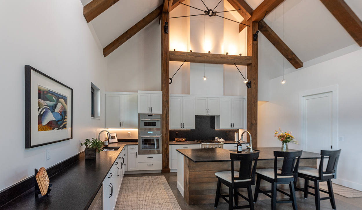 Drawing inspiration from classic caribbean style architecture, this modern contemporary farmhouse features a breezy, open air floor plan with central main living spaces, and bedroom wings on either side of the home – cleverly designed to maximize both privacy and stunning views. Dual accordion doorways mirror each other on either side of the living space, allowing the entire home to open up on sunny summer days, or to take in the surrounding snow through the walls of glass during the colder season, while offering spectacular front to back views and an airy atmosphere year-round. The great room features warm timber trusses, and a fireplace that anchors the entire living space. A picture-perfect dining table takes center stage in the main living area, and draws you over to the luxurious extra-large kitchen, a space that is a dream come true for entertaining and hosting. The oversized pantry and lengthy countertops allow for plenty of workspace, and a large island centered under the timber frame structure is ideal for staging appetizers, gathering around with friends to swap stories, and taking in the surrounding views. The primary suite is a private oasis, with a luxurious bath, his-and-hers closets, and quick access to the patio. On the opposite side of the home, two spacious bedrooms, two more bathrooms, and an expansive laundry room are thoughtfully laid out to maximize convenience and privacy. Outside, two large covered decks allow nature to come inside, and give you a front row seat to enjoy this unspoiled retreat, and everything this striking residence has to offer.