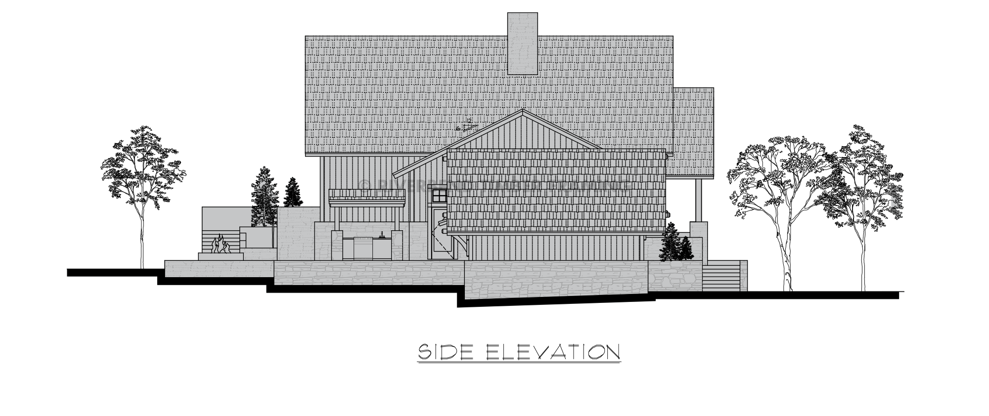 The primary suite is a private retreat, complete with a secluded patio and featuring a double sided fireplace, creating a cozy atmosphere both indoors and out. The ensuite bathroom boasts dual vanities, a private water closet, and a spacious walk-in closet. Two additional bedrooms share a Jack and Jill bathroom. Outside, impressive patios with a fire pit extend the living space, providing opportunities for endless outdoor enjoyment. The Bar Harbor floor plan embodies craftsmanship while emphasizing comfort, functionality and the seamless integration of indoor and outdoor living. Whether situated on a sloped lot or nestled into a picturesque setting, the Bar Harbor offers a distinctive mountain-style retreat for those seeking a blend of natural beauty and architectural elegance.