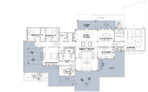 If your building lot has a gentle slope, you could choose to level the space or choose a design option like the Bar Harbor, where three distinct sections of the home are located on slightly different levels. In this example, the garage steps up into the shared living space, then another set of stairs move up into the part of the layout with the bedrooms.