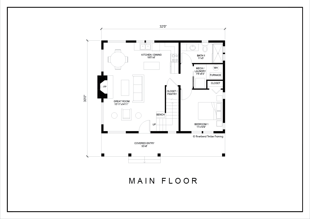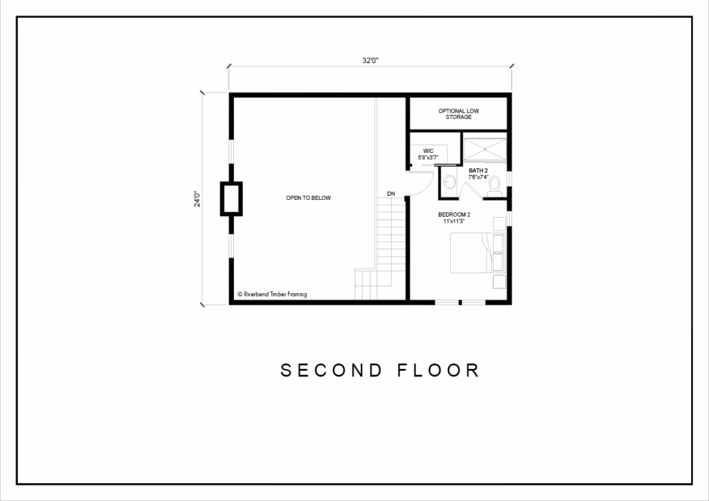 Welcome to the Kalkaska, where rustic beauty and timeless elegance come together to create a haven of comfort and tranquility. This inviting cottage welcomes you from the moment you step onto the porch. Upon entering, you’ll find yourself in the heart of the home – an open concept main living area with high ceilings exposing the rich timber frame above, and a stone fireplace to anchor the space. A built in bench and coat hooks maximize the space. The kitchen exudes rustic charm while maintaining modern amenities, featuring an island and adjacent dining nook. The main level bedroom has well placed windows to provide privacy while highlighting the views, and a cozy bathroom and central laundry round out the main floor. Open stairs lead to the second story master, a comfortable, intimate space with an attached bath featuring a shower and walk-in closet. Back outside, the exquisite timbers and decorative details of the full length porch make for the ideal spot for a cup of coffee, to relax and soak in the view. Kalkaska’s rustic yet refined energy showcases traditional craftsmanship, warmth and nostalgia, highlighting the natural beauty of the great outdoors… ready to welcome you home.
