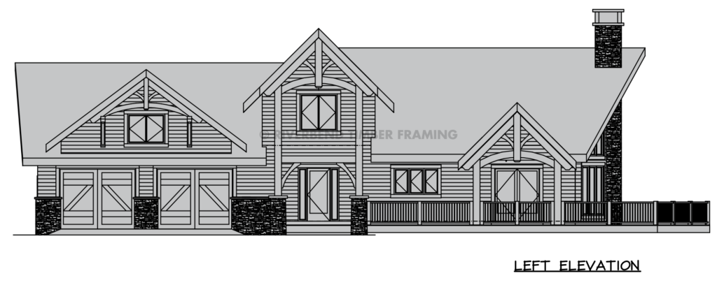 The Mason timber frame floor plan is a classic example of mountain style design, with a prow window, separated by a floor-to-ceiling chimney. The main living area is open and provides plenty of space for friends and family. Rustic timber trusses inside and out the mix with stone and shingles to blend with the mountain locations where these homes are most common.