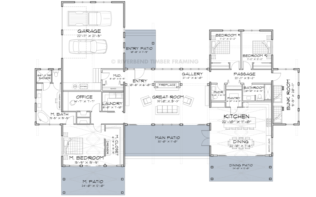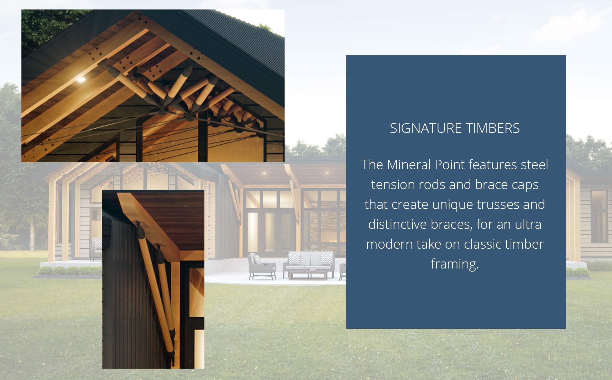 When it comes to stand out design, Mineral Point makes a commanding statement. The symmetrical shapes create a striking first impression, and the shed rooflines mixed with contemporary farmhouse style gable roofs beckon you to explore the home further. Mineral Point is designed around a central courtyard, for effortless single-story living and entertaining with ease. The courtyard looks in at a mesmerizing interplay between the timbers and metal accents of the structure, creating a truly one-of-a-kind look for the home. The light-filled floor plan features 3 bedrooms + a bunk room, 2.5 baths and a private office. The great room has sky-high vaulted ceilings, two accordion doors and wall-to-wall windows, merging the interior with the exterior courtyard and views beyond. The adjacent kitchen and dining room highlights are a walk-in pantry, plenty of workspace, a buffet counter, a large island, and accordion doors to the dining patio as well as direct access to the central courtyard, making this perfect for family gatherings and entertaining. On the opposite side of this balanced home is the spacious private master wing and office, with a fully outfitted walk-in closet, a dazzling five-piece master bathroom, and another set of accordion doors leading out to the master patio – perfect for enjoying coffee with a view. Mineral Point comes alive as the sun goes down, with a soft lighting plan that illuminates the impeccable details of the timbers and trusses, creating a warm atmosphere to gather around and enjoy quality time with loved ones.