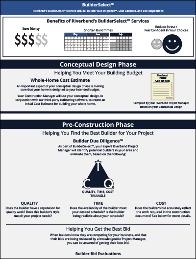 If you would like assistance finding a qualified general contractor to build your home, Riverbend’s BuilderSelect™ construction solution is for you. Our project management team has the experience and knowledge to find and evaluate qualified general contractors to build your home. The BuilderSelect™ service will help you secure the best builder for your project.