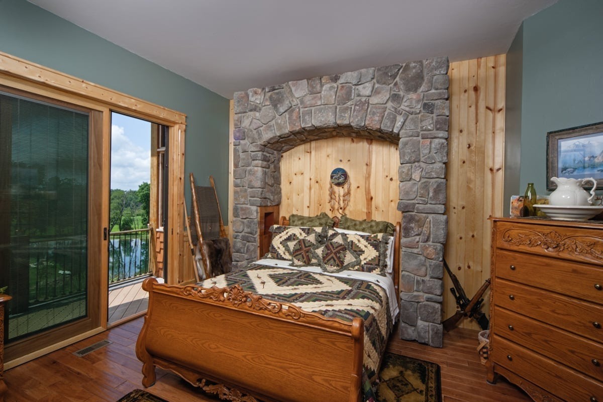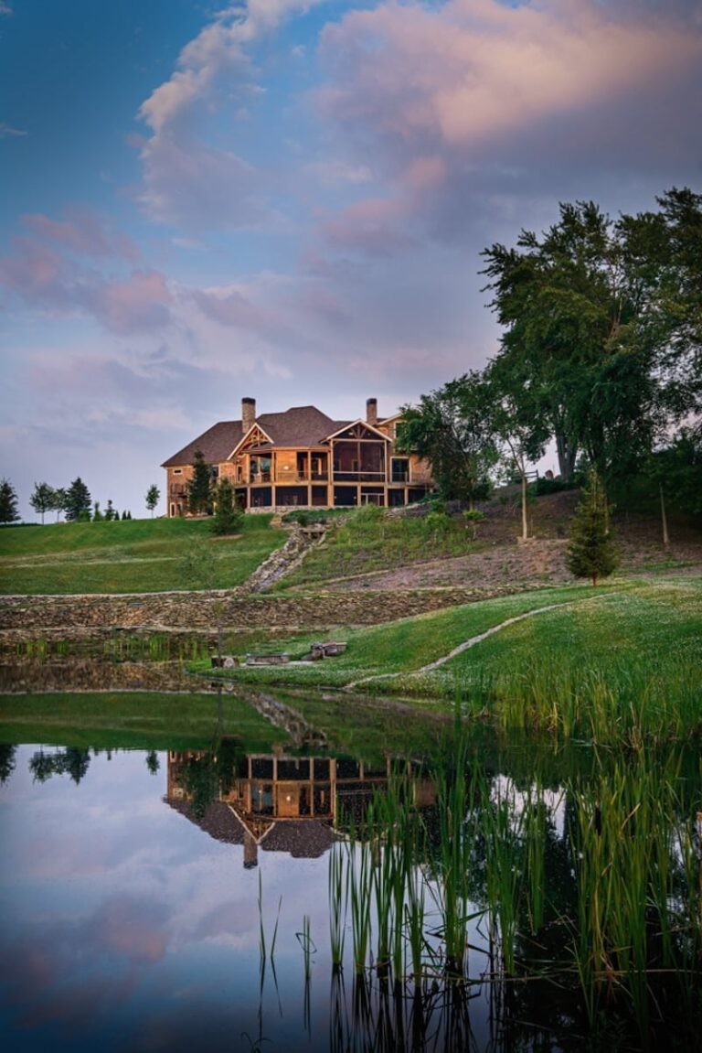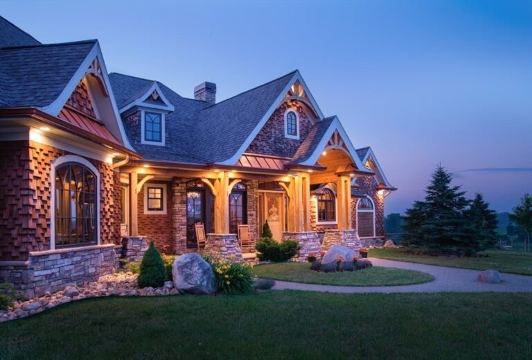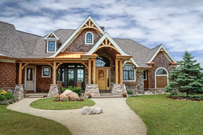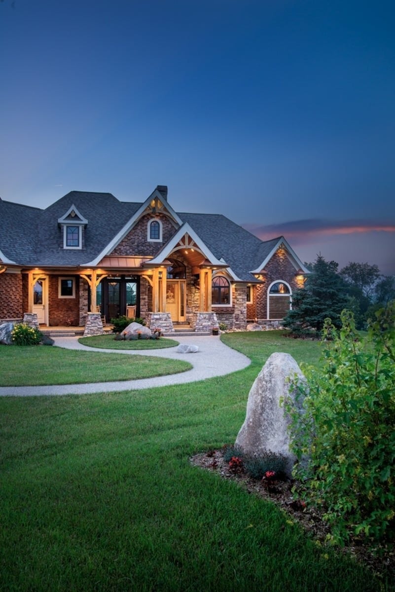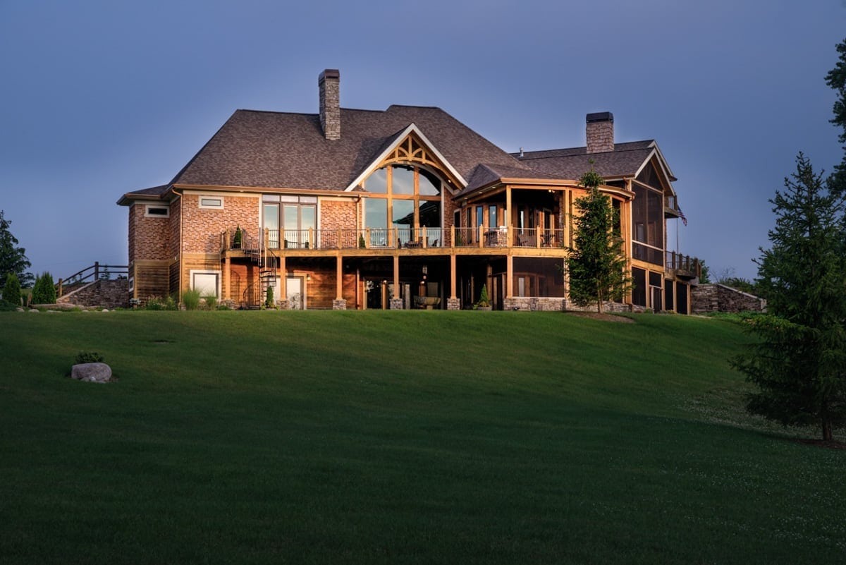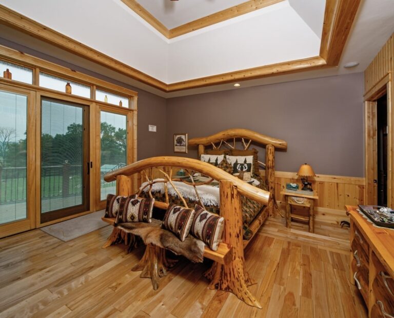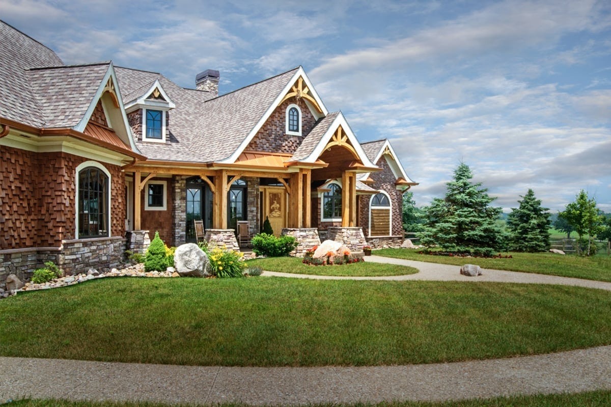 Inspired to build their dream home by memories of a childhood cabin, owners of this Battle Creek, Michigan home chose to incorporate artisan details to capture the pioneer spirit. Queen post timber trusses, a timber-framed front deck, and hand-split cedar shake are just a few natural elements that add to this timber frame home’s rustic charm.