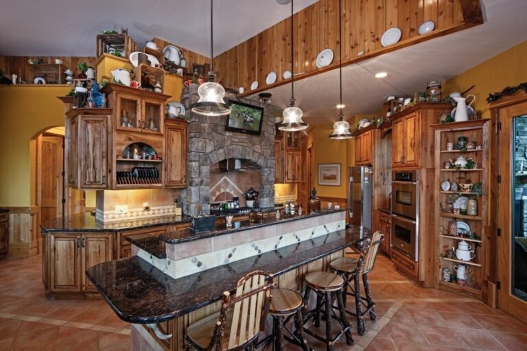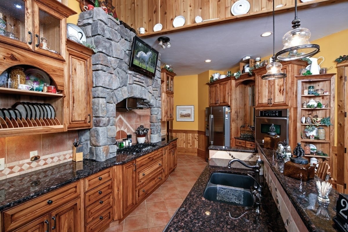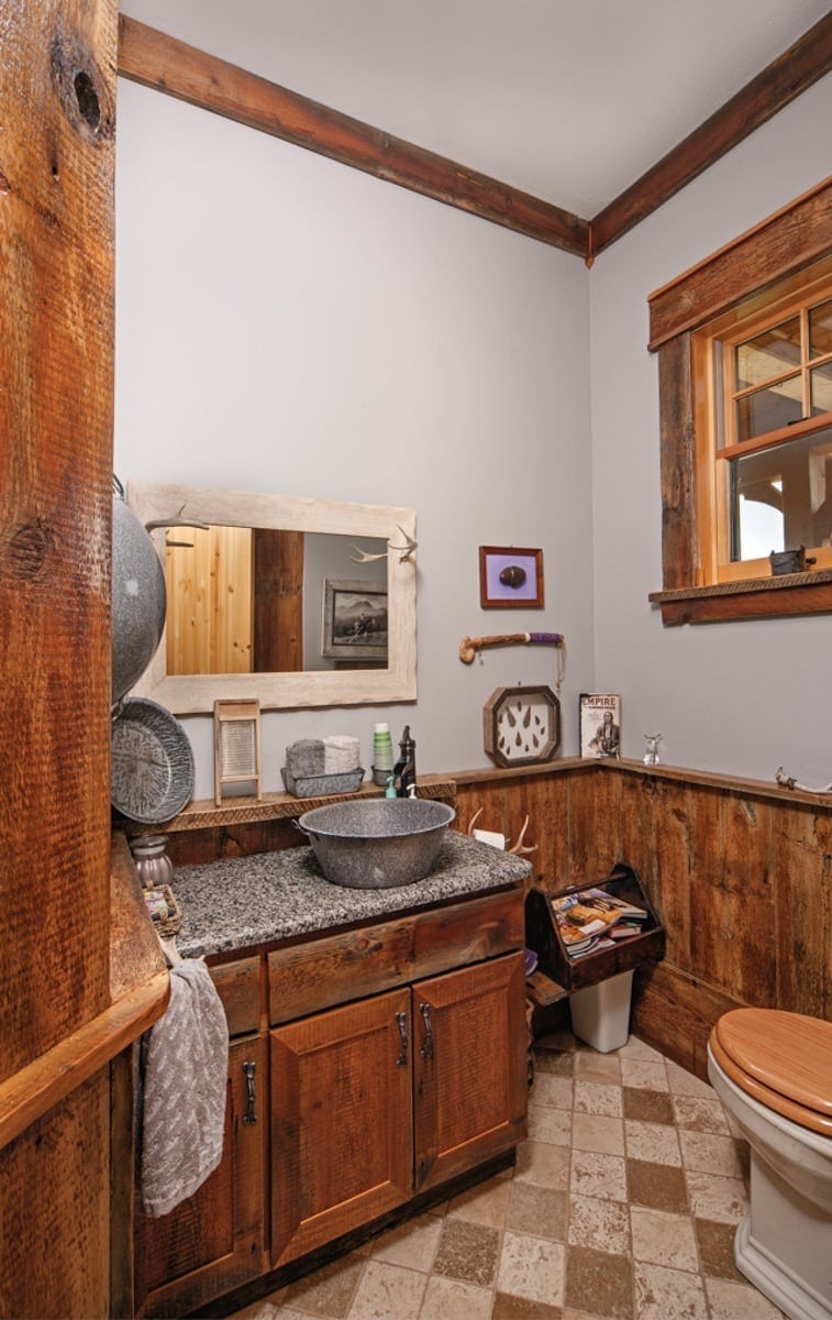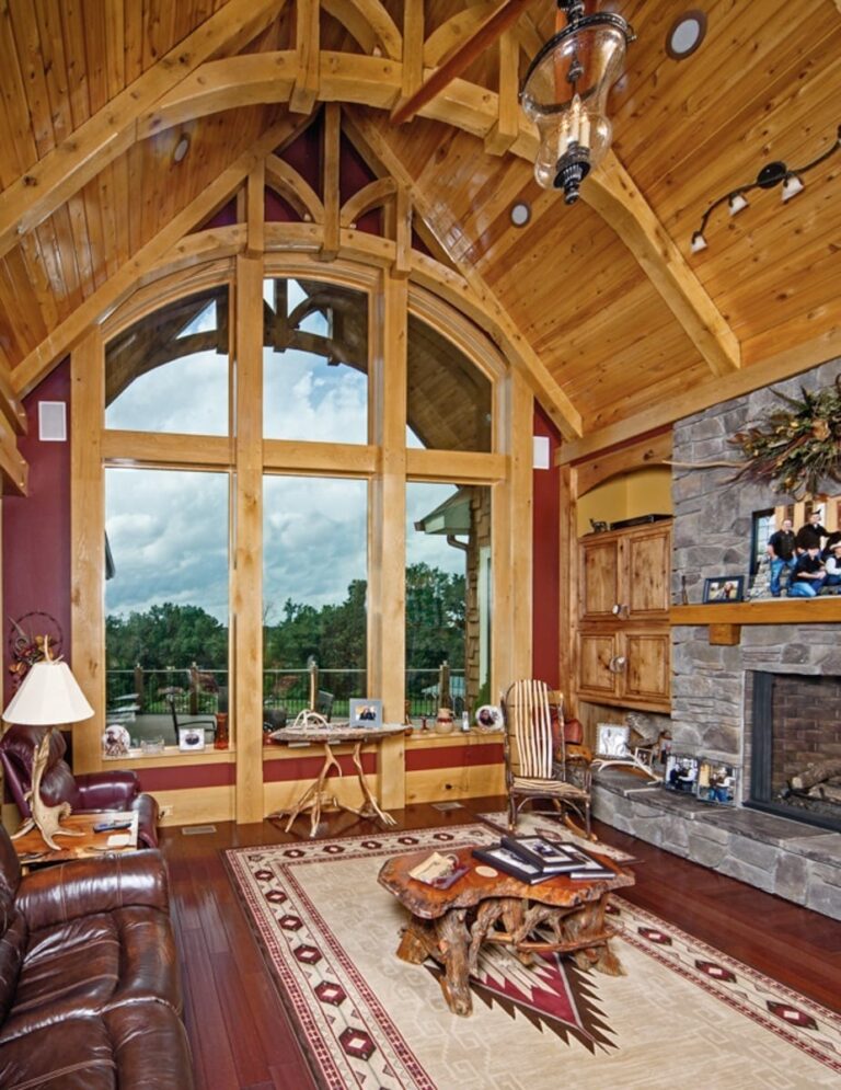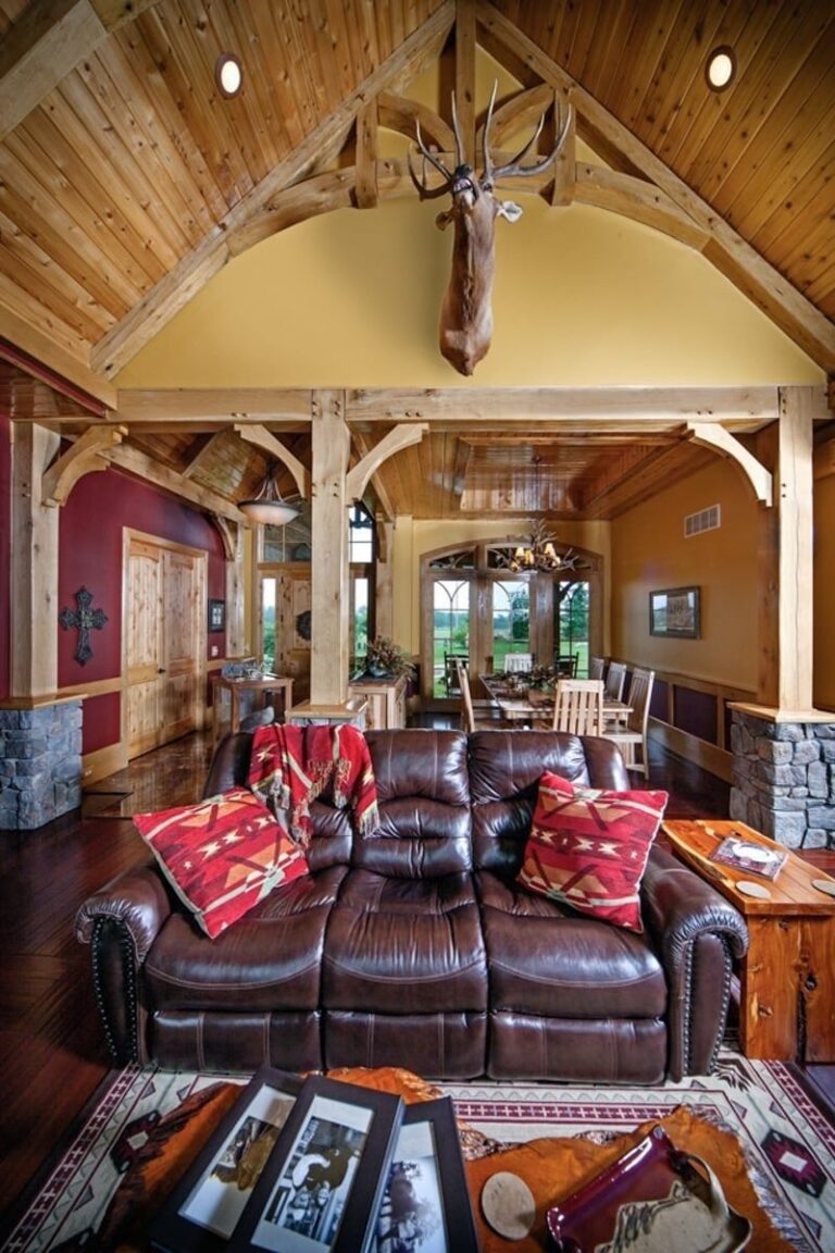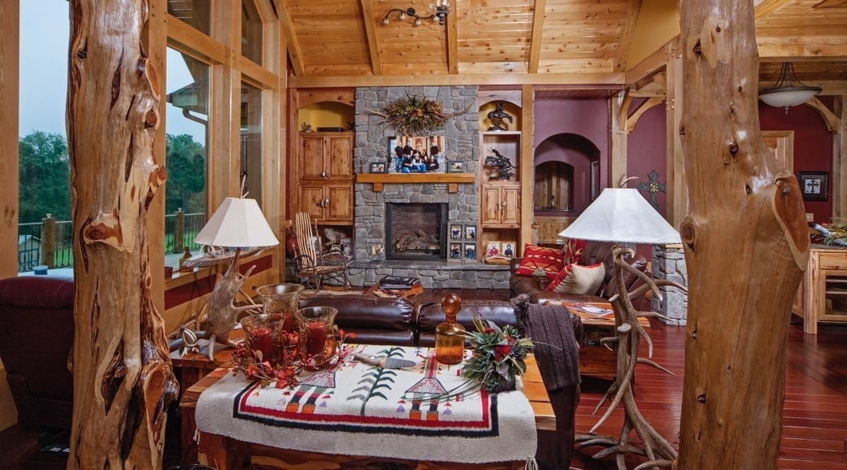Behind the front door, which is etched with a likeness of James Earle Fraser’s “End of the Trail” sculpture, timber trusses and beams in the main living area give the large space the intimate feeling the homeowners desired.