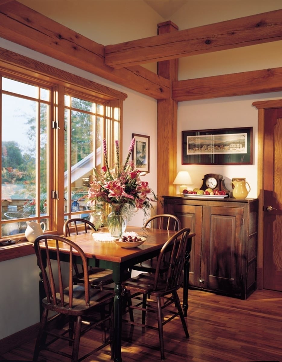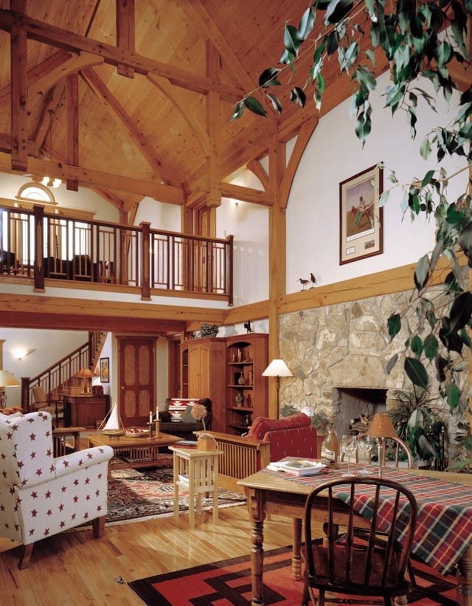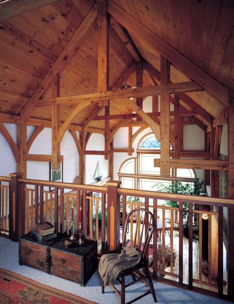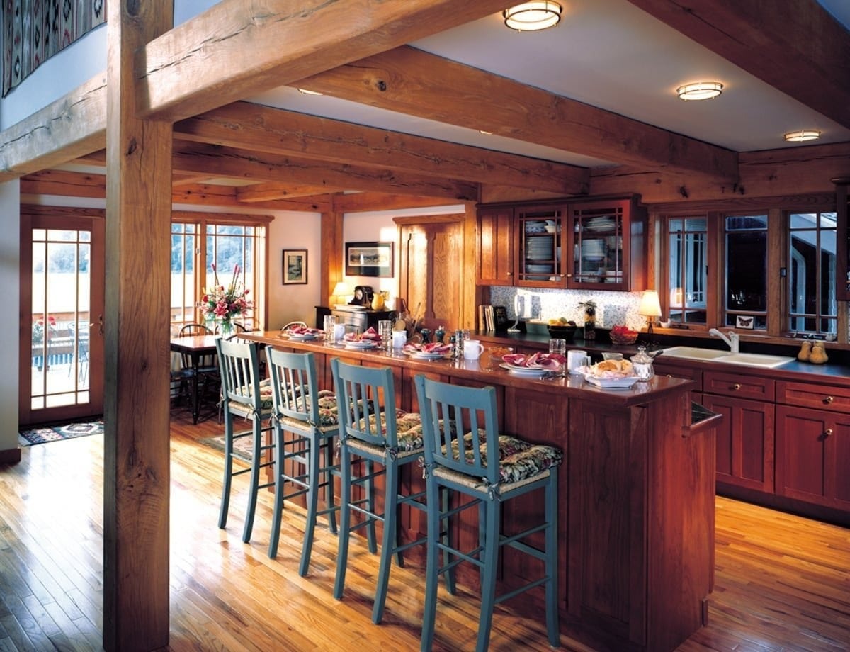 Inside, you can see detailed woodwork from the intricate window trim and railing spindles to the custom timber framing of the rafters. Horizontal timber beams in the kitchen area help create an intimate space for gathering.