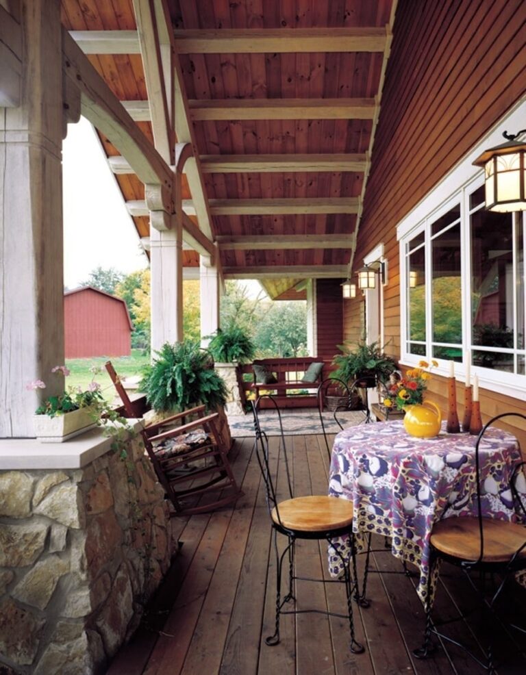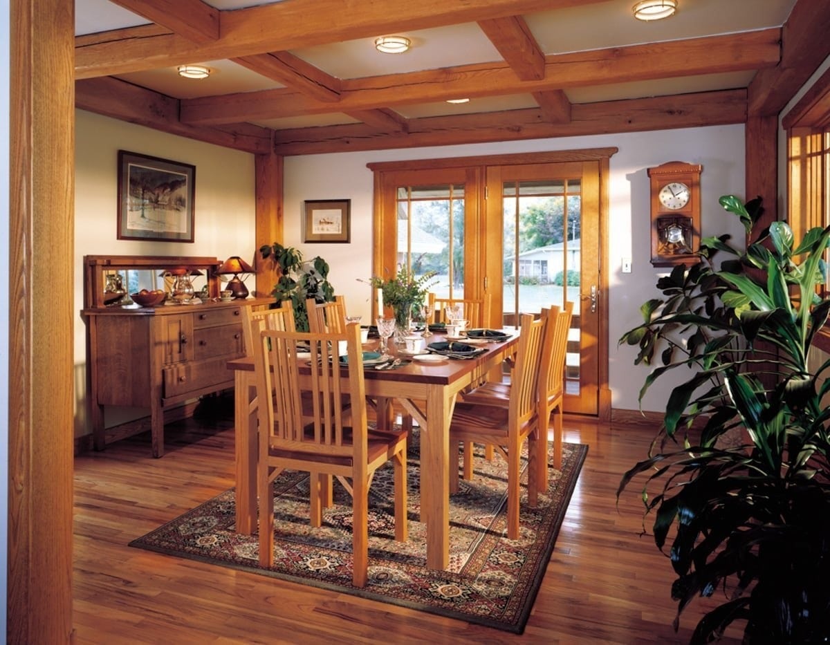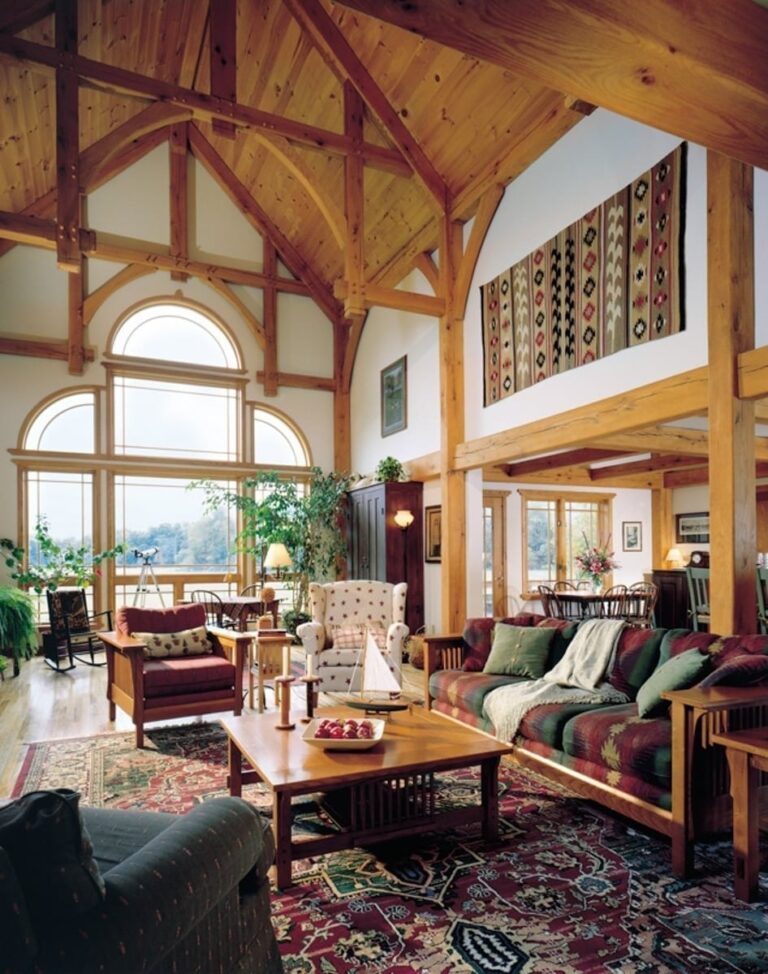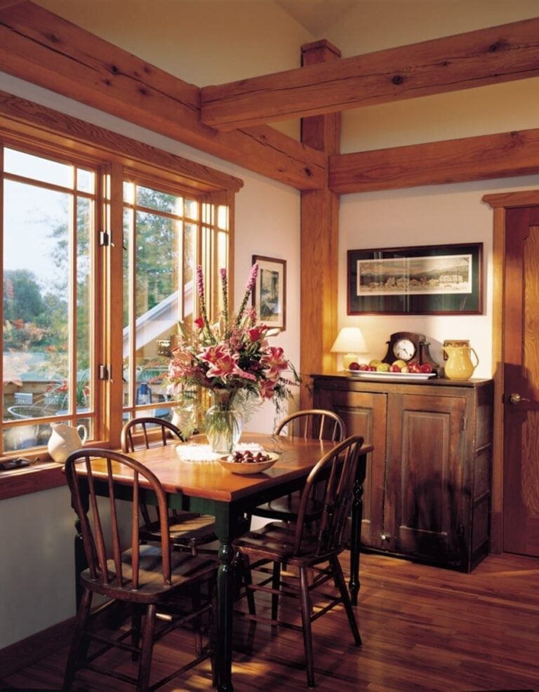Inside, you can see detailed woodwork from the intricate window trim and railing spindles to the custom timber framing of the rafters. Horizontal timber beams in the kitchen area help create an intimate space for gathering.