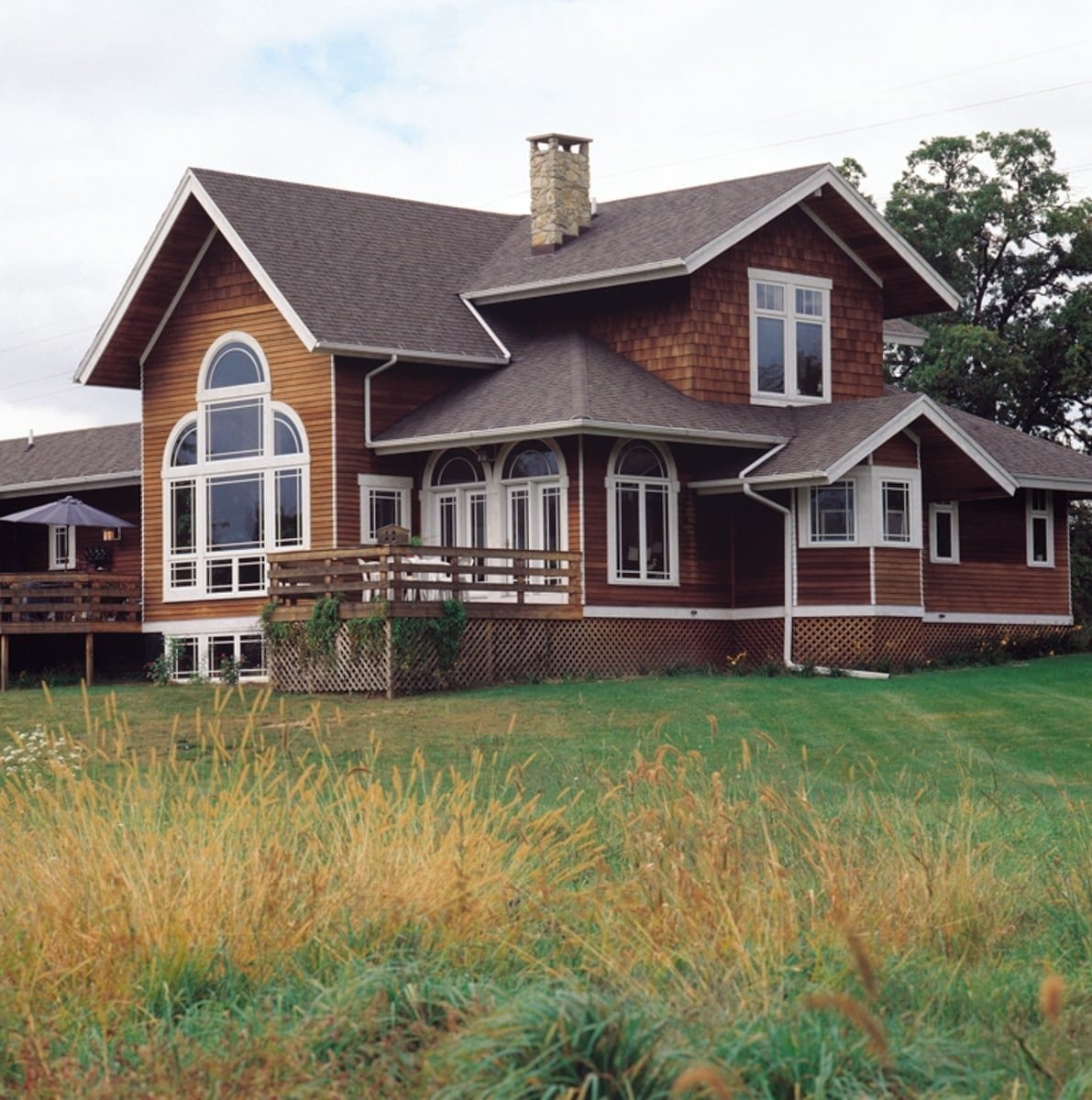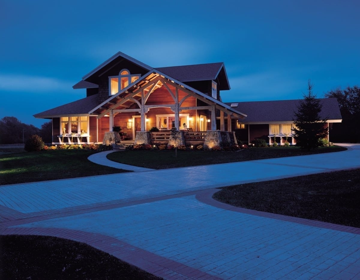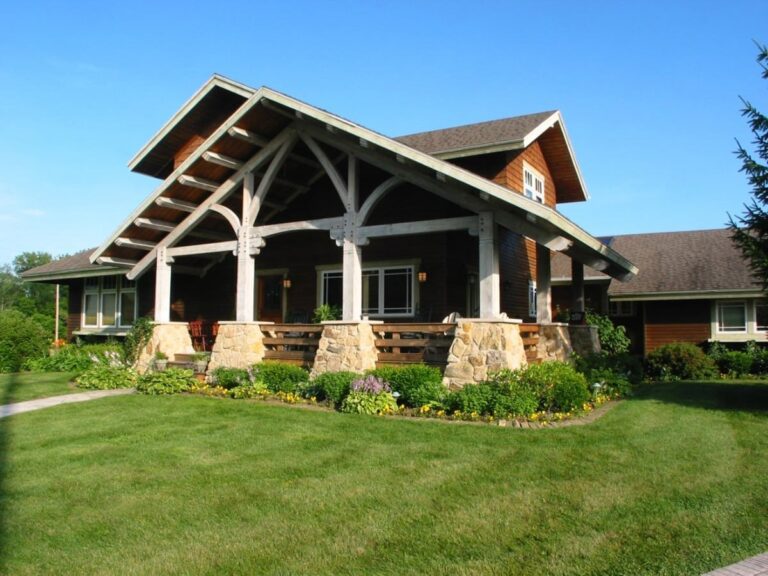 Combining dark wood paneling and shingles along with the contrasting bright white trim, this timber cottage fits perfectly in a pleasant meadow of a Blissfield subdivision. Low-pitched rooflines, artistic timber framing, and a covered porch are characteristics of Craftsman-style architecture which the homeowners wanted to emulate.