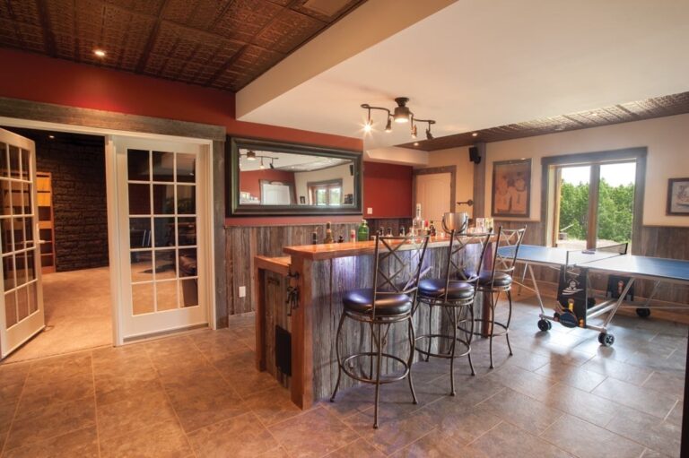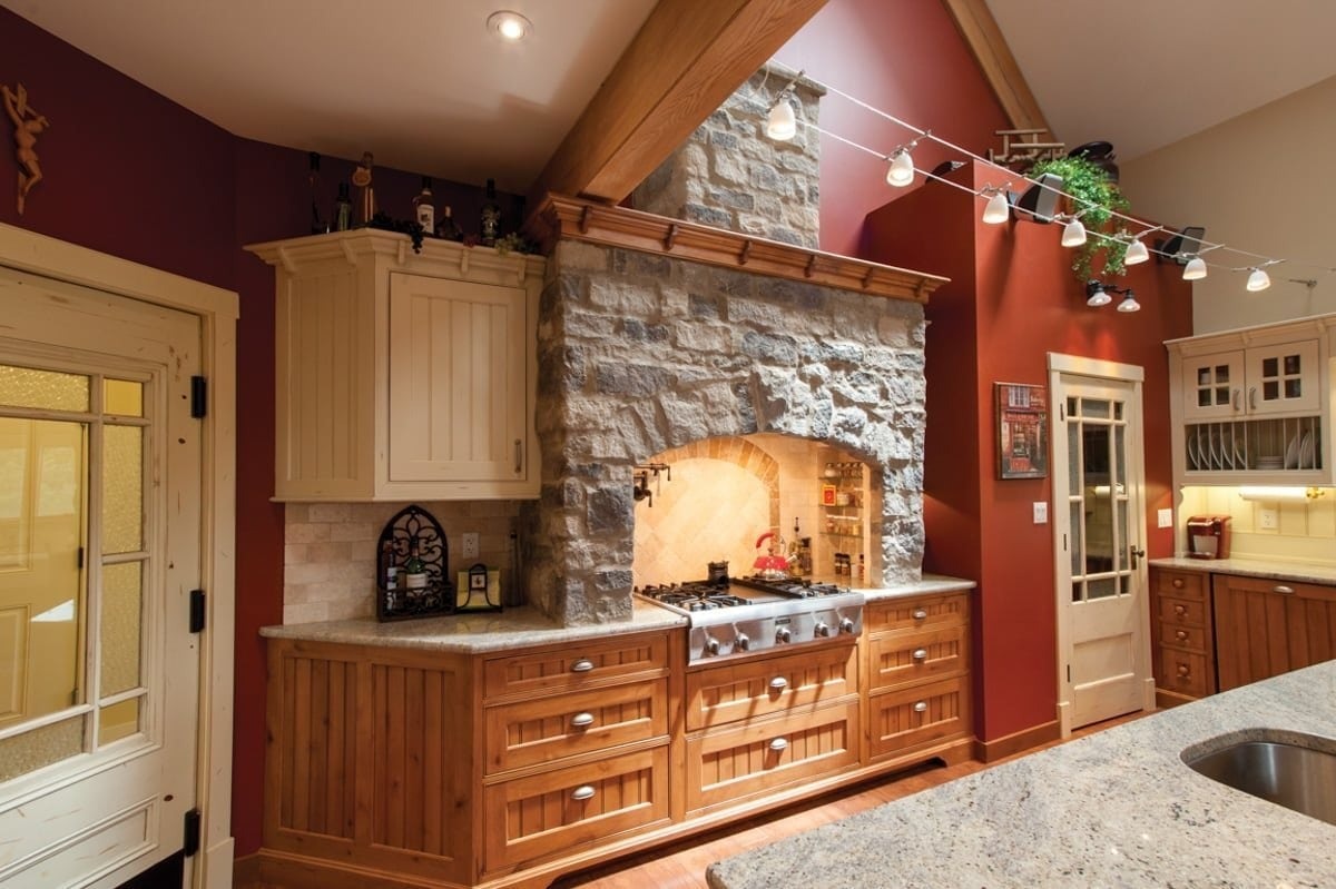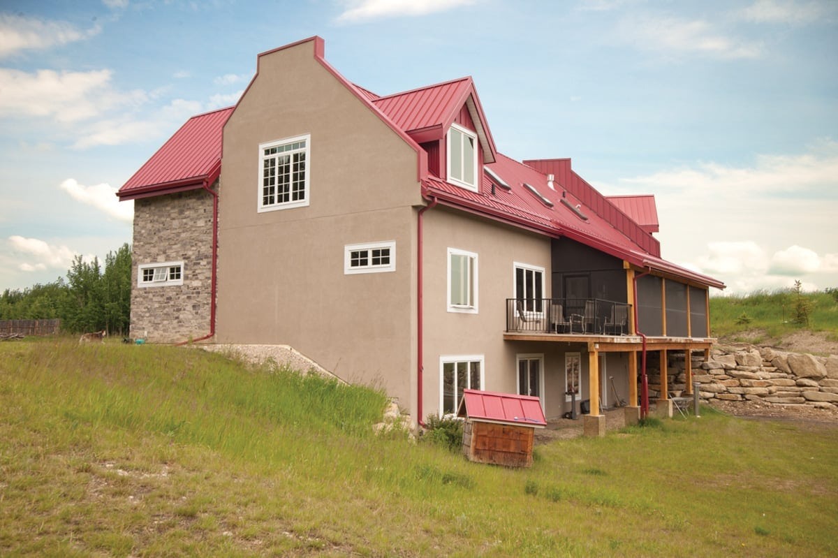 This Calgary residence combines its owners’ desire for a home that resembles traditional farmhomes of Quebec with their need for energy efficiency. Simple rooflines and dormer windows create the silhouette of a farmhouse while colonial-style windows, stone, lantern light fixtures, and barn-style garage doors add to the home’s country ambiance.