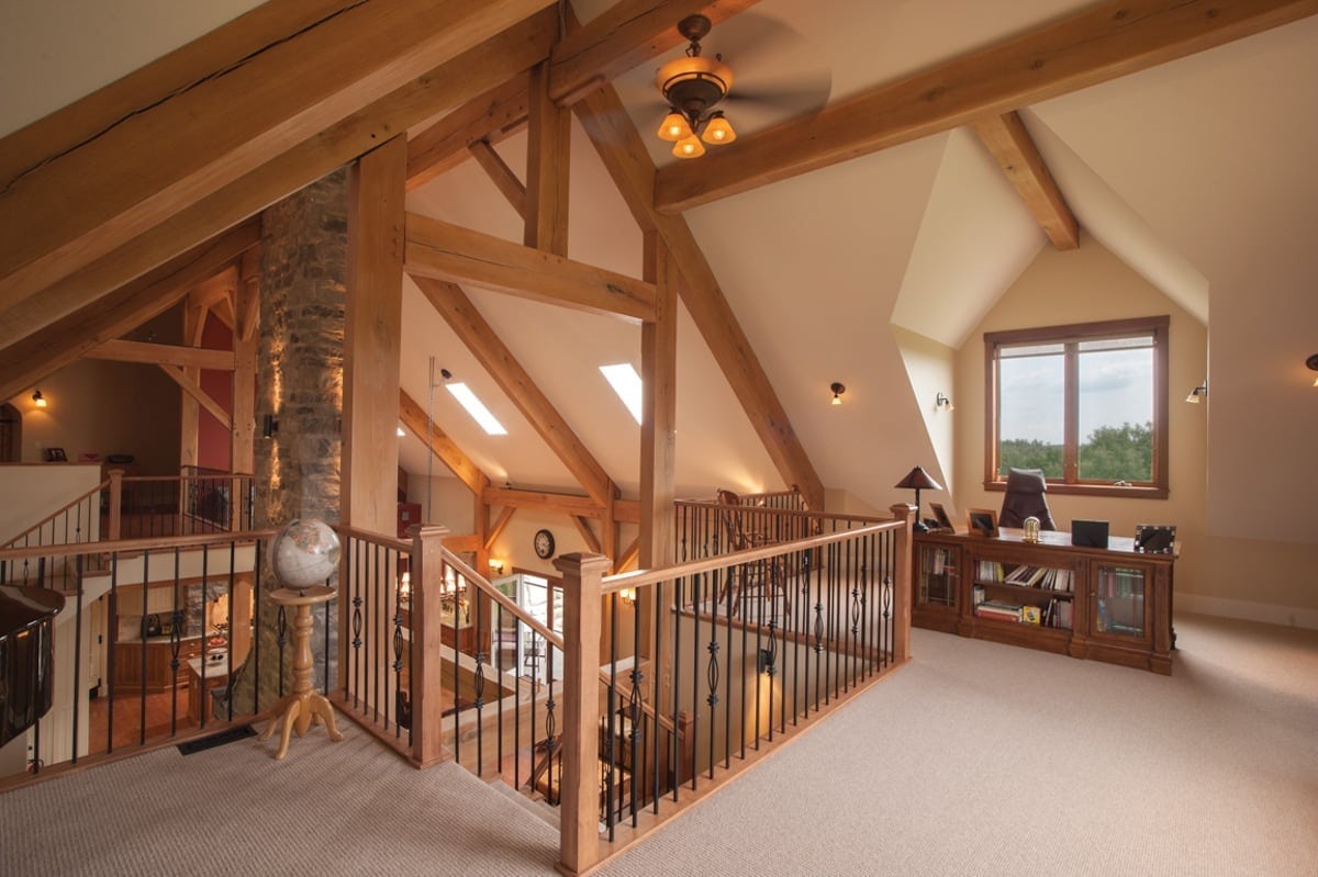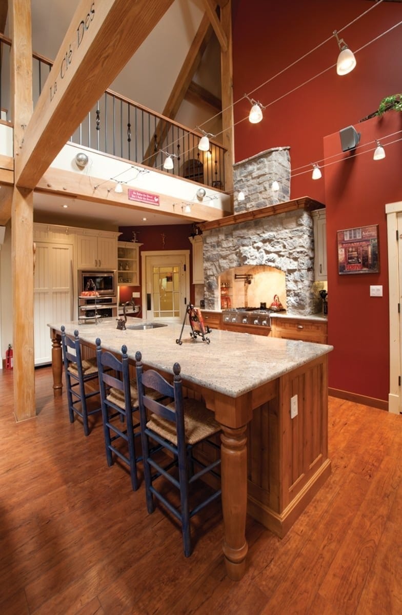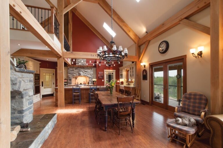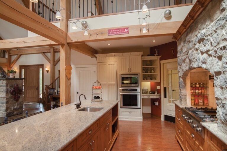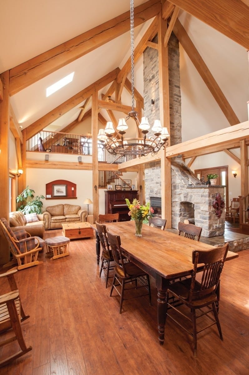 Beautiful timber framing spans from the kitchen to the dining room and through the vaulted living room. The style of the timber framing accentuates the farmhouse look of the home.