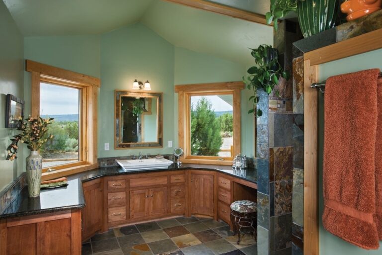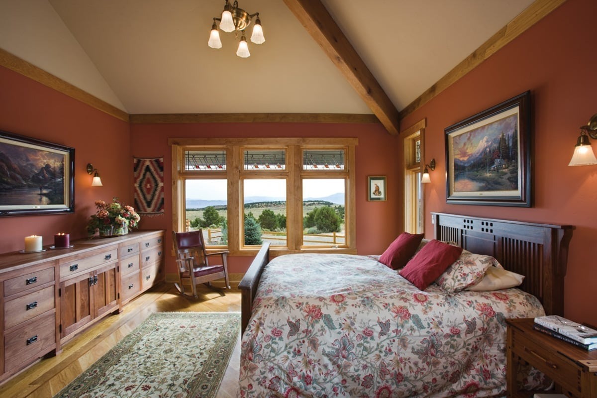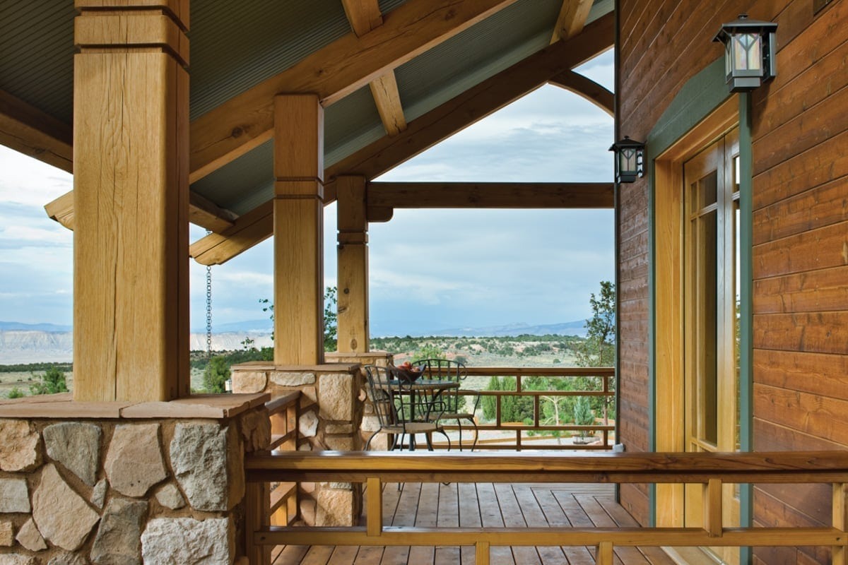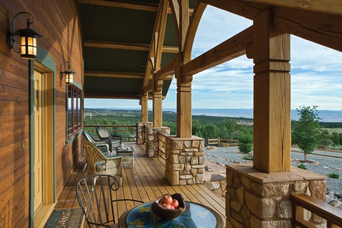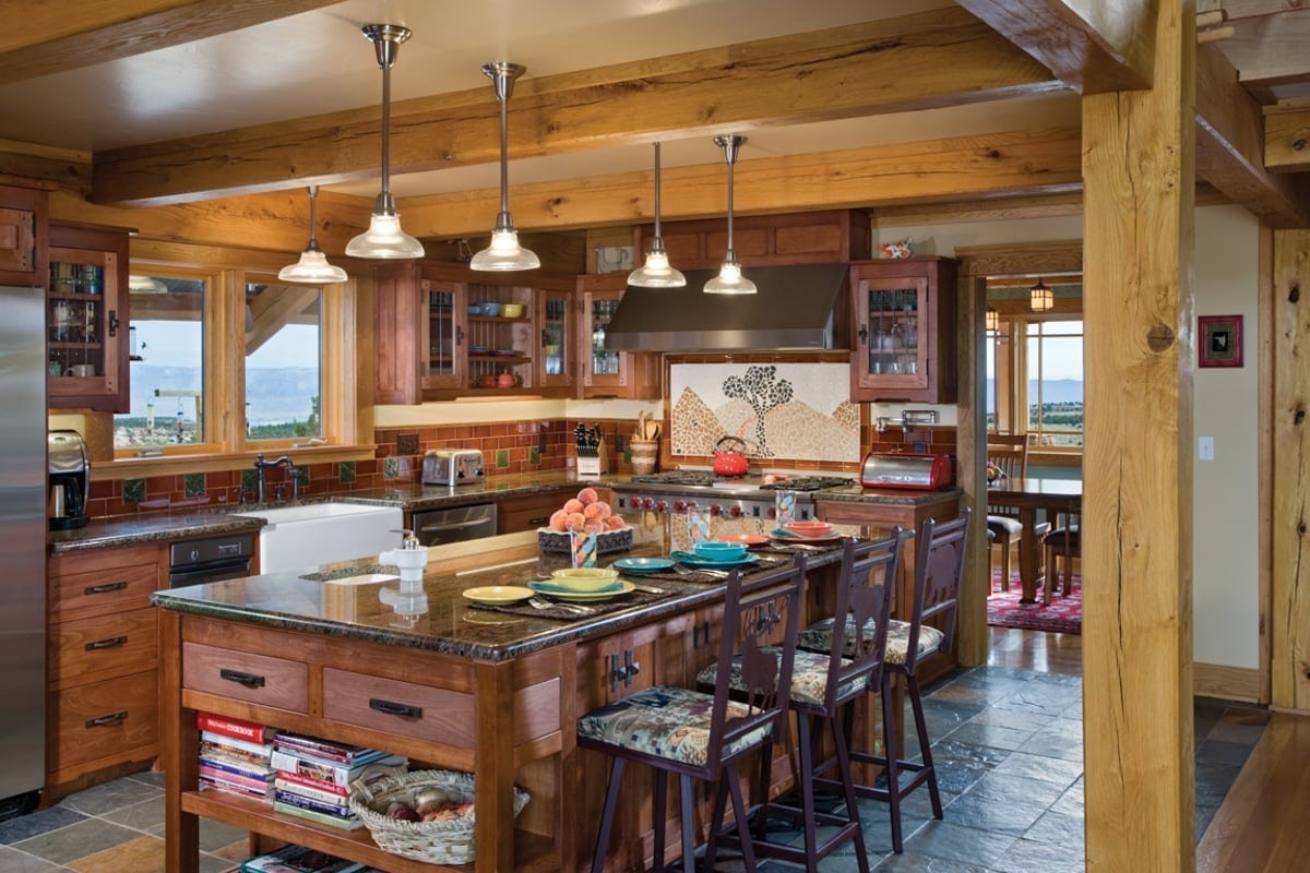 The architectural style of this timber frame home in Colorado is unmistakably Craftsman. Inspired by the works of Gustav Stickley and the Greene brothers, traditional craftsmanship is showcased throughout the home. A wide eave overhang covers the front porch where a custom timber truss adds architectural interest to the home’s entry. Natural Colorado stone, wood lap and shake siding, and banded windows complete the home’s exterior look of Western elegance.