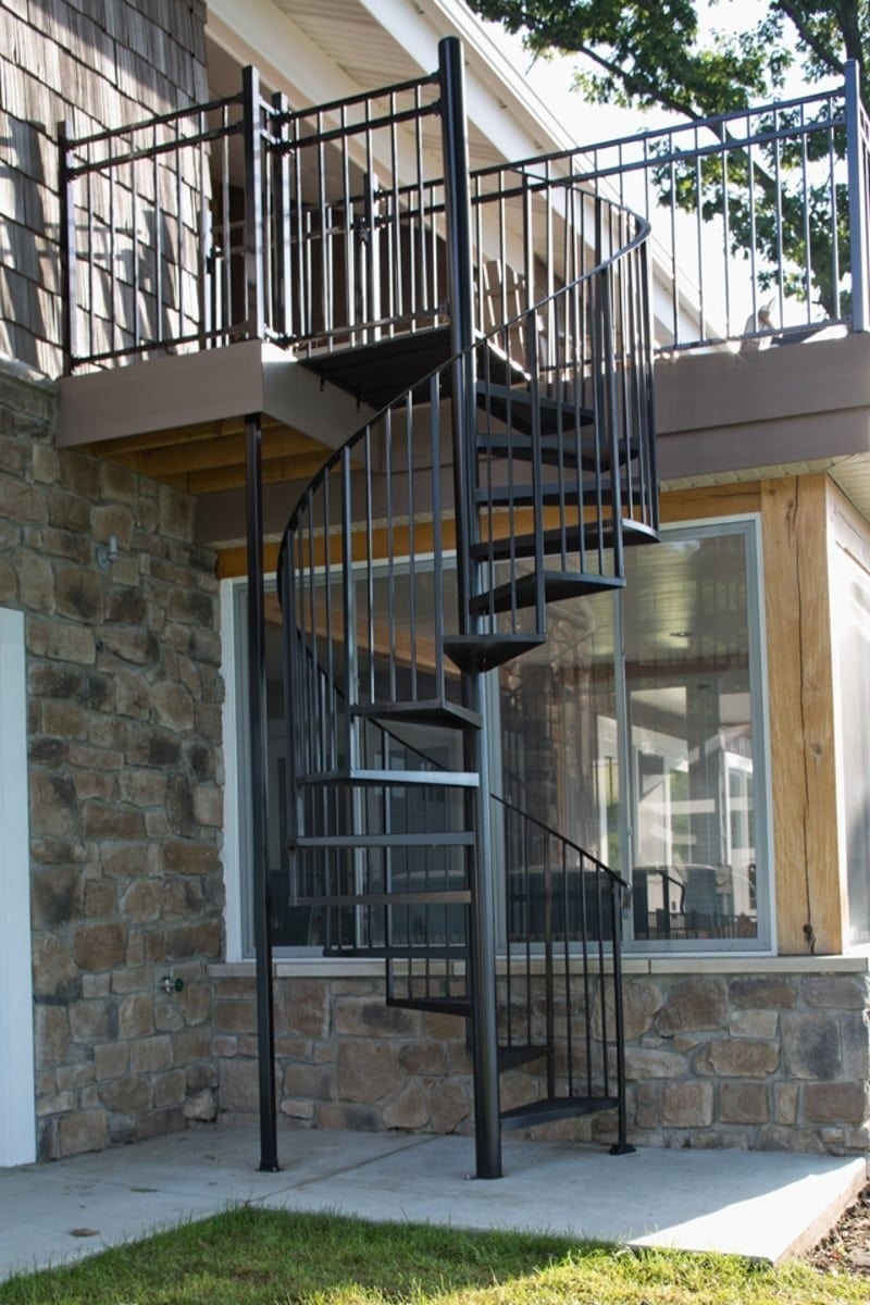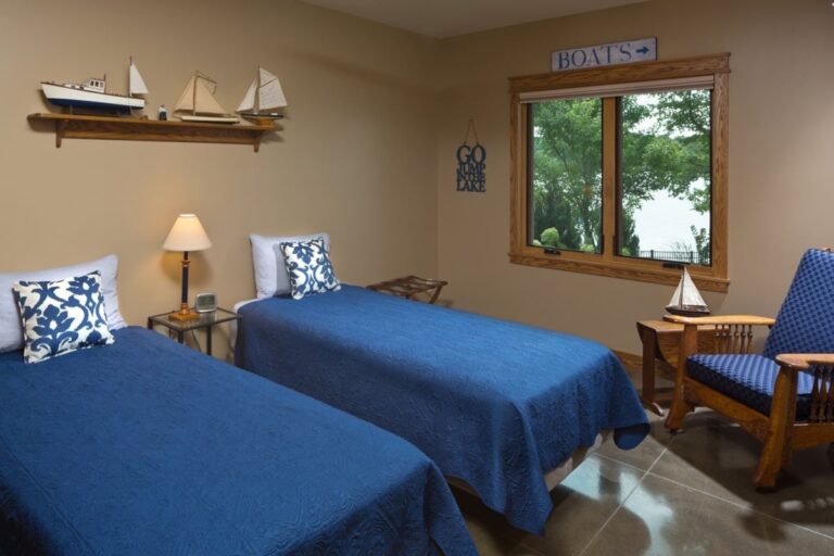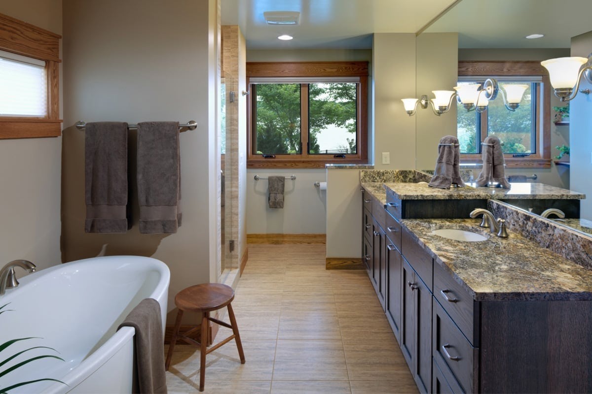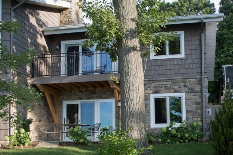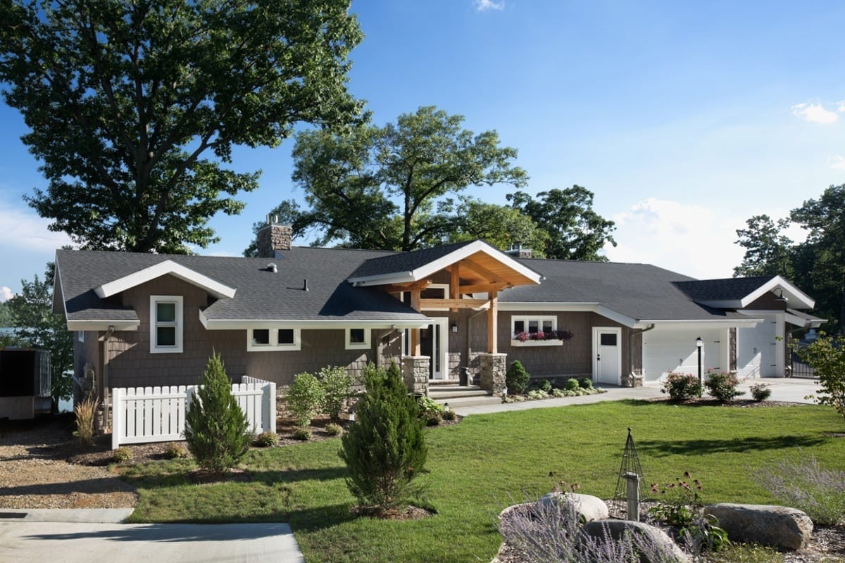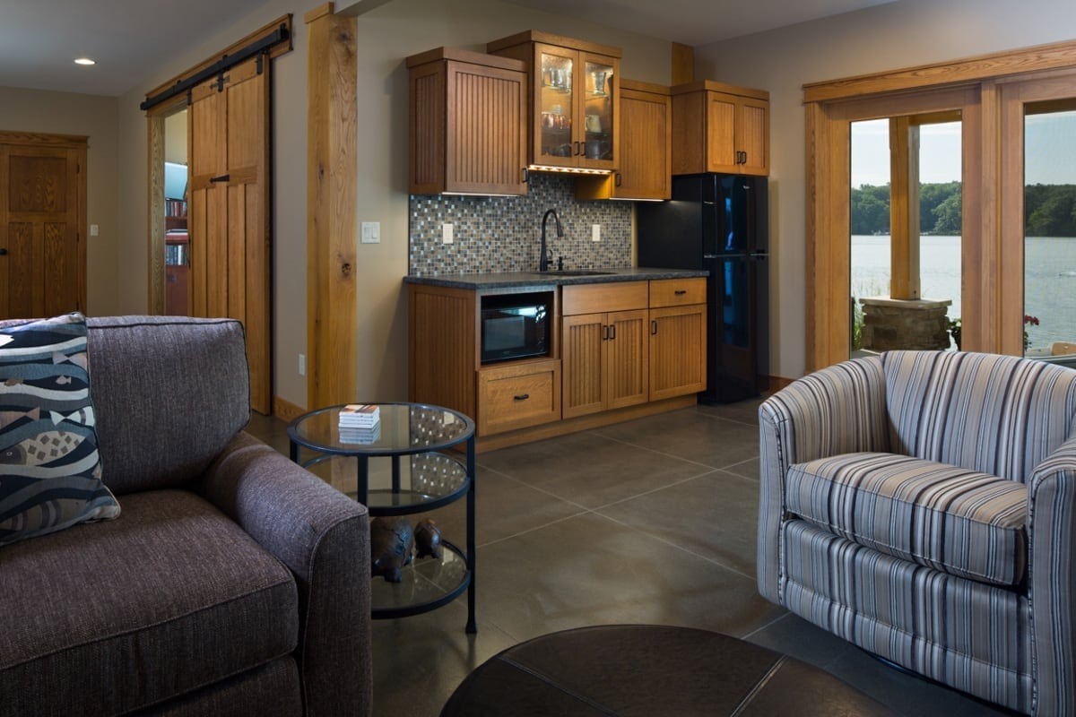 This Kalamazoo home was masterfully designed as the perfect lakeside getaway. The rear elevation takes full advantage of the homeowners’ Sherman Lake vistas. This includes lots of big windows, a second-floor balcony with an outdoor kitchen, and a private balcony off the master suite. These are joined by a guest room patio and sunroom that includes a fireplace and mounted television.