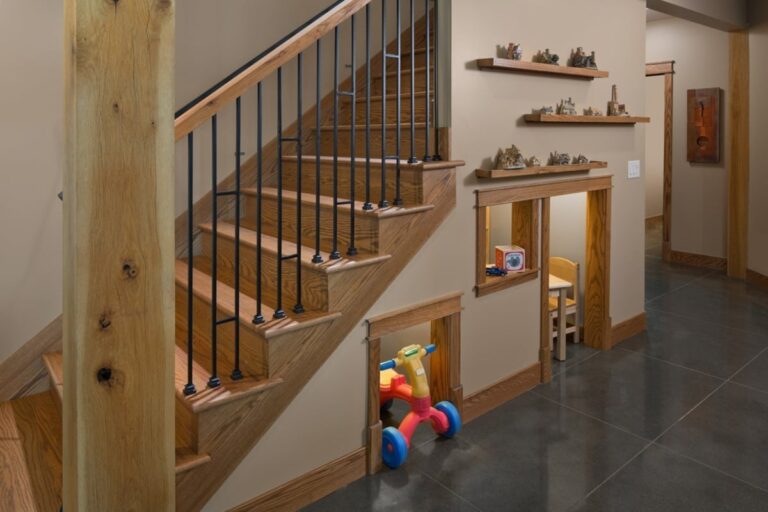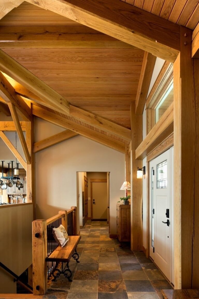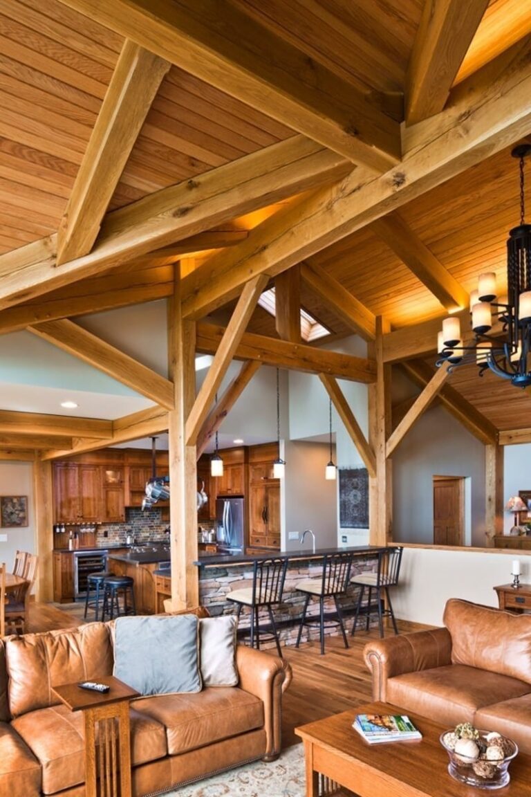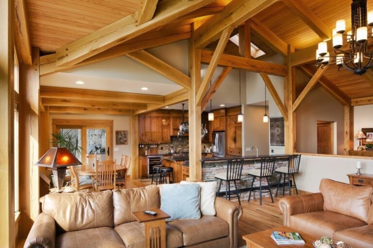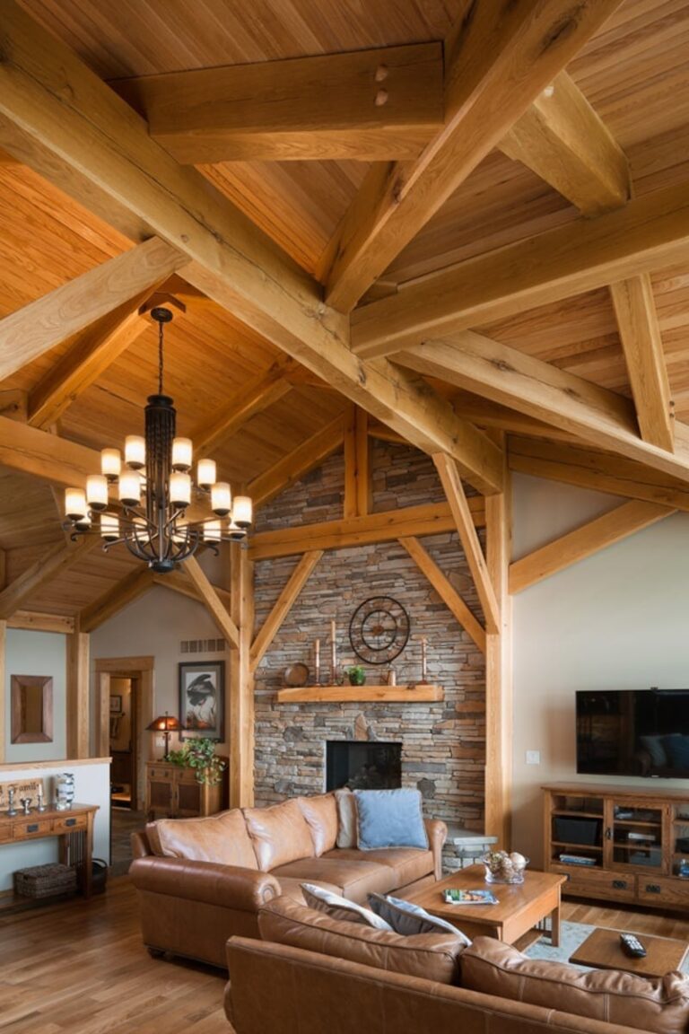 On the inside, the home’s timber framing takes center stage. The great room ceiling is lined with detailed timbers connected at intriguing angles that not only support the roof but create beautifully rich warmth and artistry.