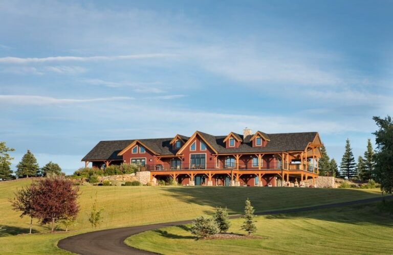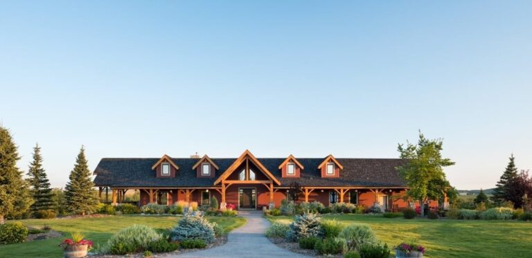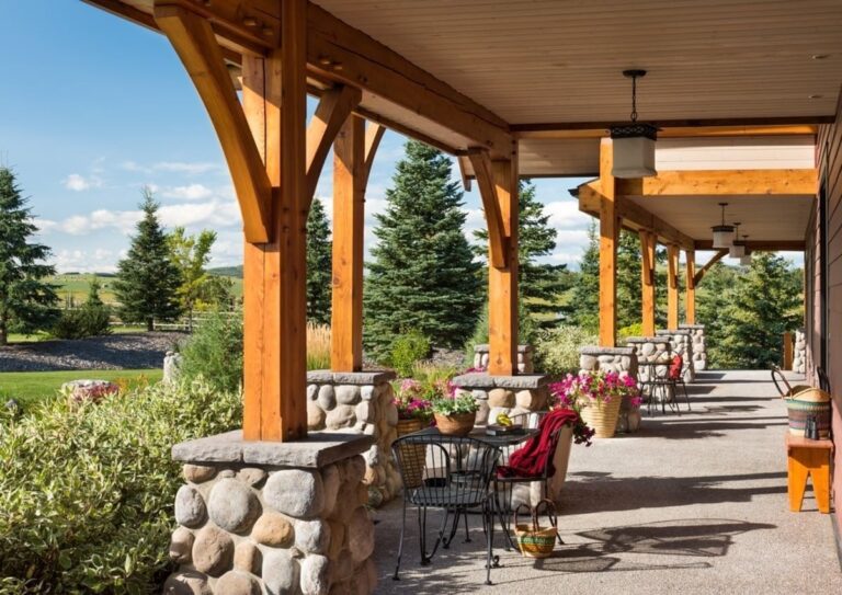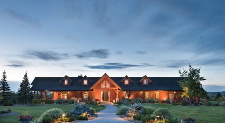 This ranch-style home sits on property near the Sheep River and has panoramic views of the prairie, farmland, and mountains that surround Okotoks, Alberta. A traditional wrap-around porch provides space for the homeowners to enjoy the scenery from any direction.