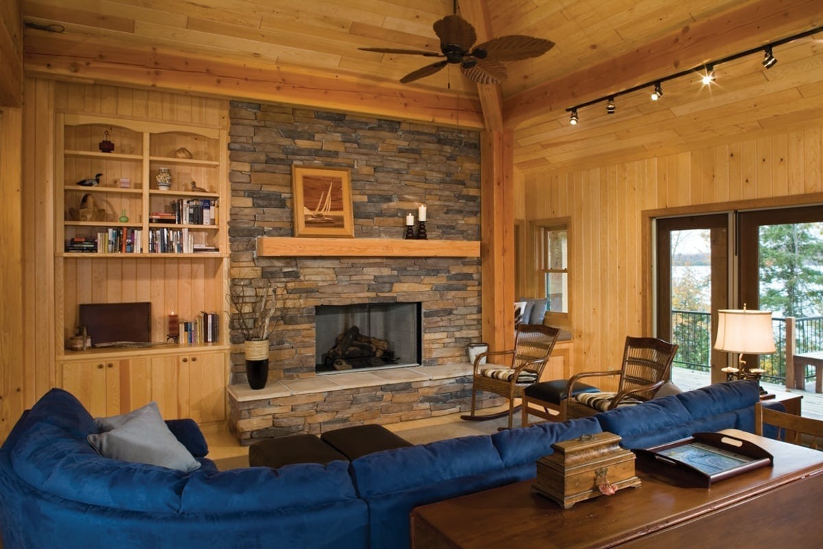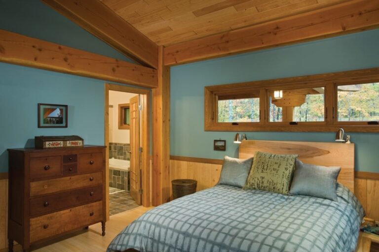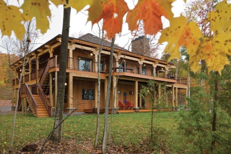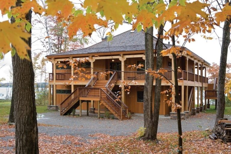 Just off the shore of Petoskey’s Lake Wallon sits a distinct Japanese-style timber frame home. Timber post-and-beam construction was particularly appealing to the homeowners who fell in love with the square layout prevalent in Japanese homes.