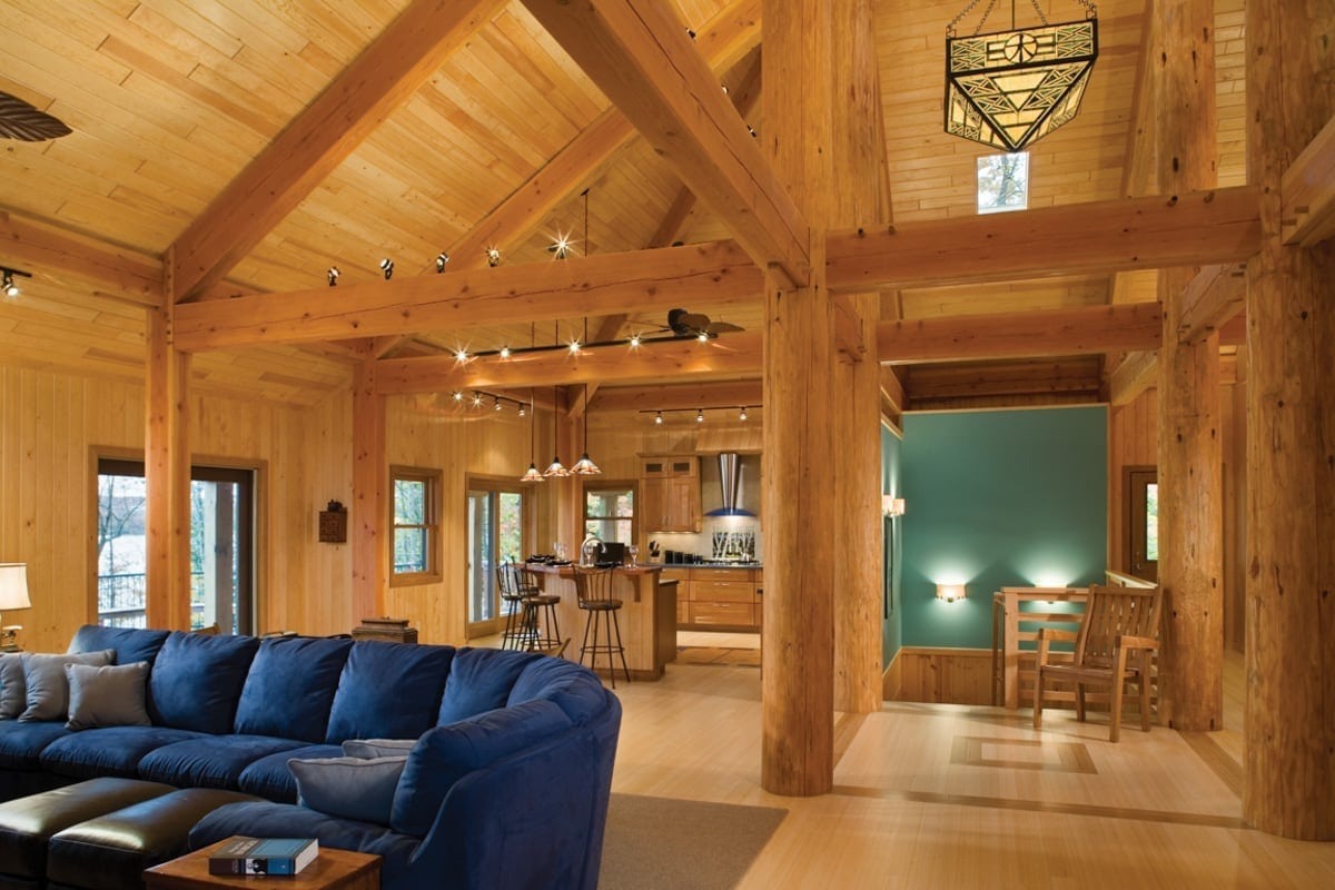 As you enter the home, your eyes are directed to its center, where four, 38-foot-tall log posts stretch from the bottom floor, through the main level, and up to the roof. The massive round posts are a hub for the interior timber frame structure. Following the roof lines and spanning across each designated space are the beams that connect to the posts by traditional mortise and tenon connections.