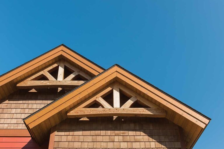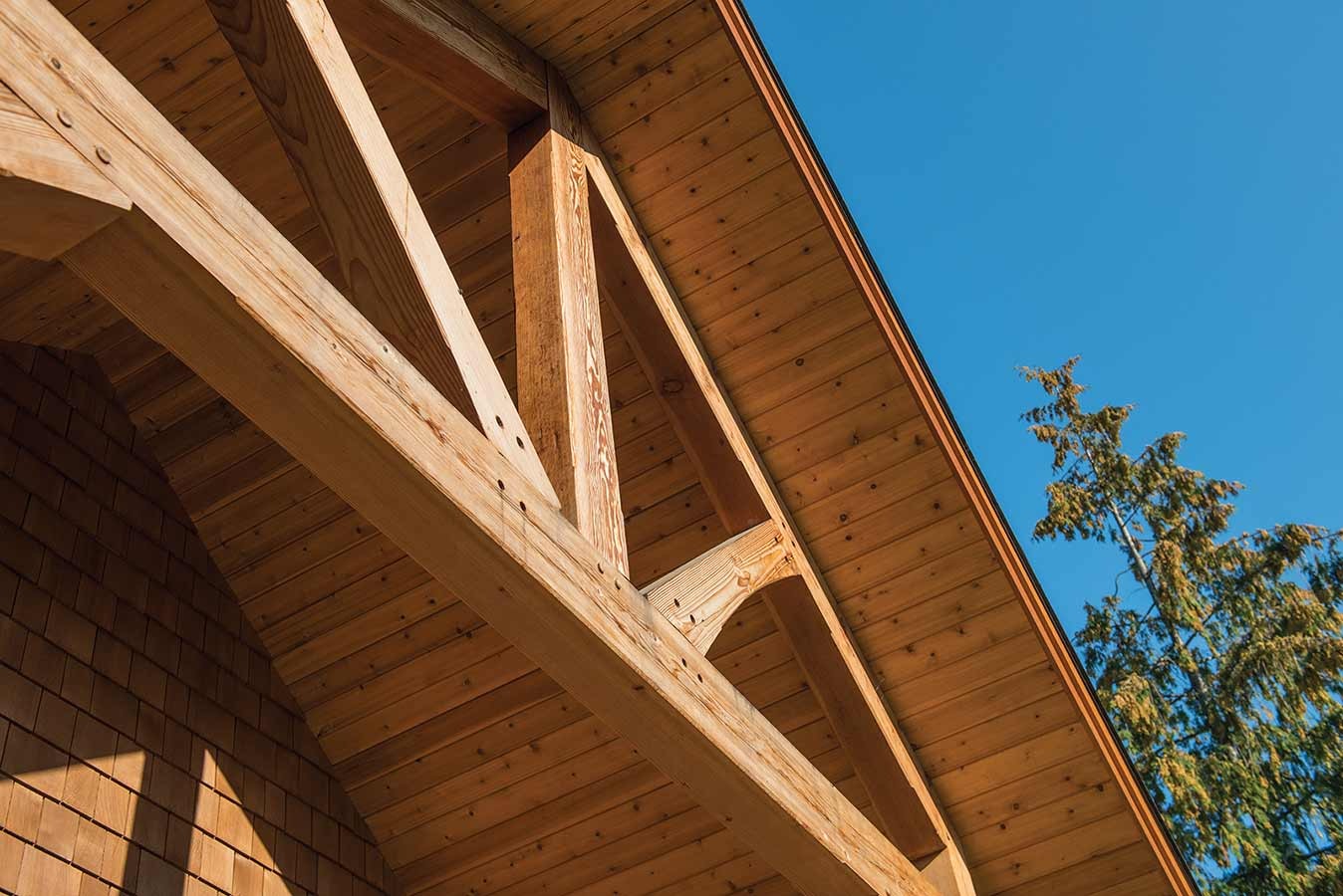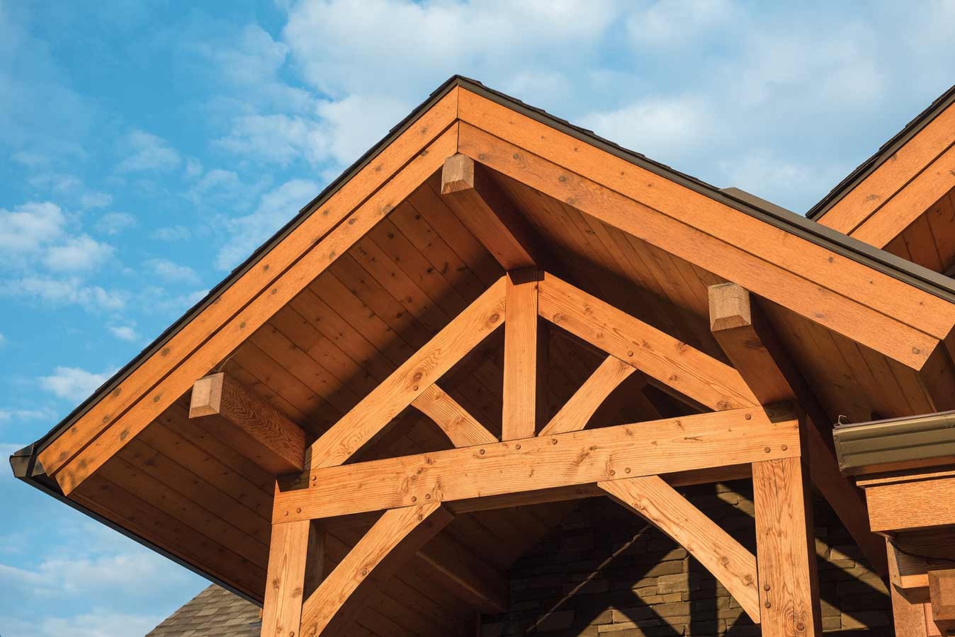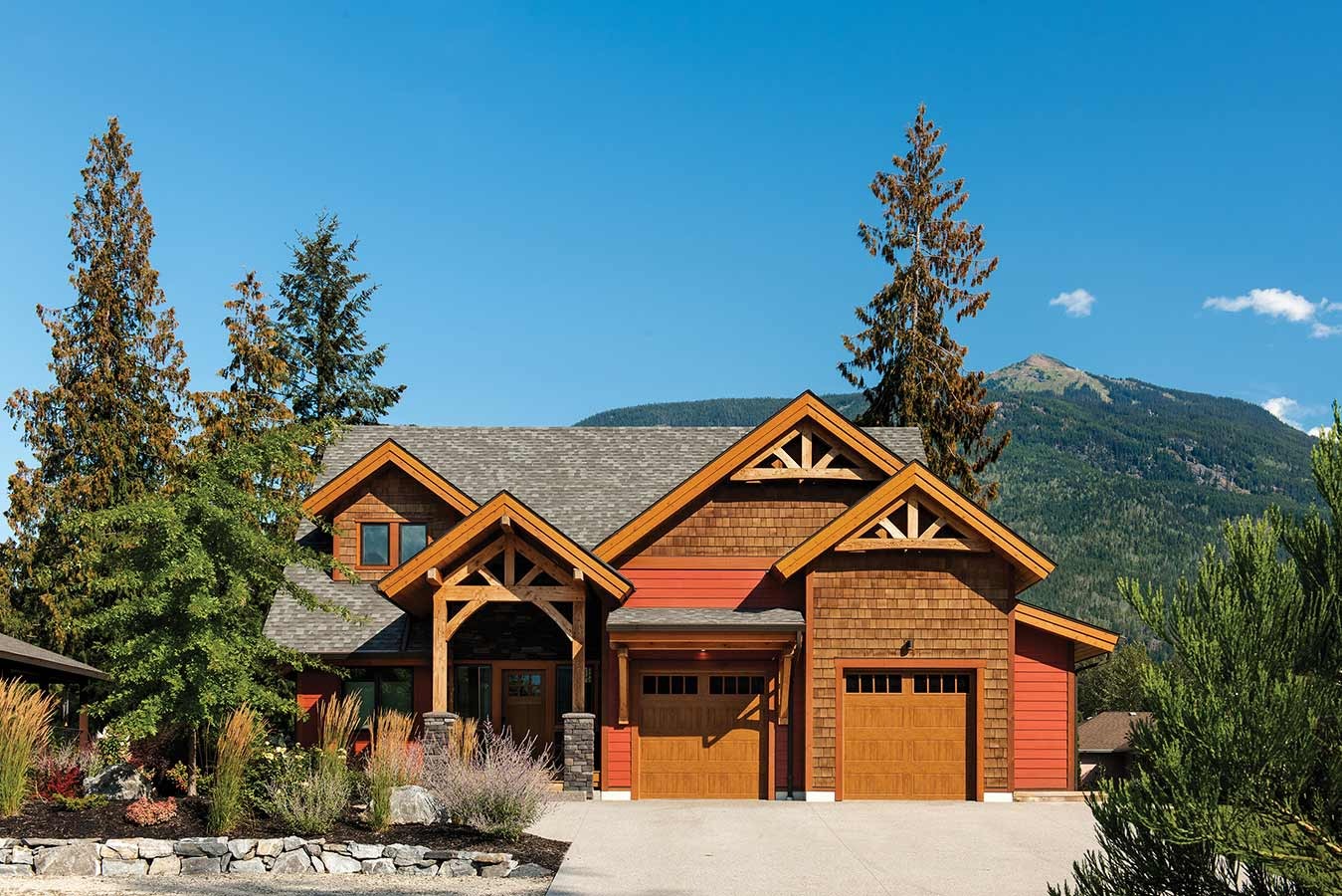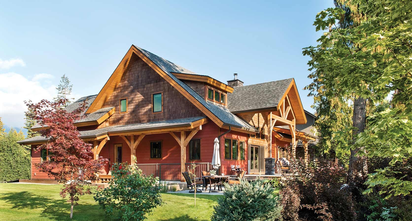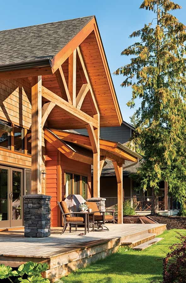 Not all mountain homes are located in remote places. This timber home is a good example of how a mountain style design can blend in with a rustic neighborhood. With less room available for outdoor space, the outdoor living area was wrapped around the home and broken into distinct areas. An extended shed roof over the master suite portion of the deck helps create it sown space while providing additional shade from the morning sun.