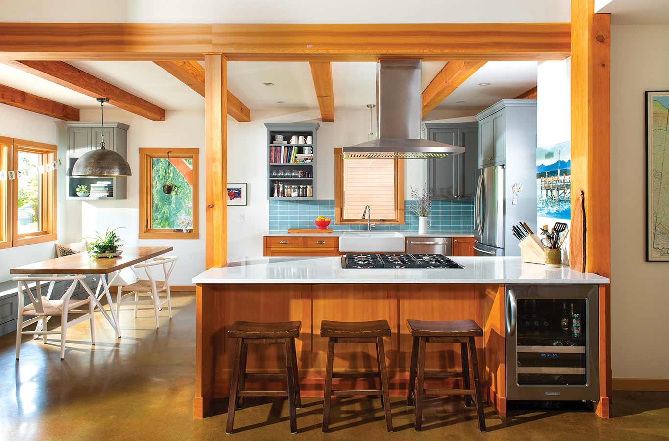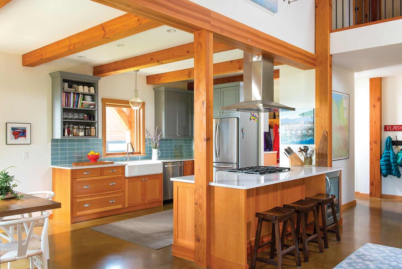 This ultimate family home is located in a quiet neighborhood near historic Revelstoke Resort. Open and bright, with beautiful timber framing throughout, the spaces are designed to provide the room they need while remaining comfy and cozy. Amazing mountain views entice the family to partake in the myriad of outdoor activities for which Revelstoke is known; with their timber home providing the perfect anchor for them to return and recuperate.