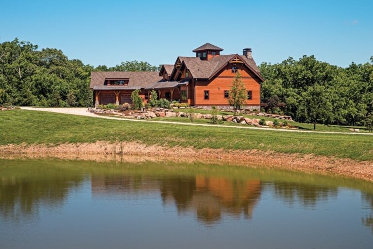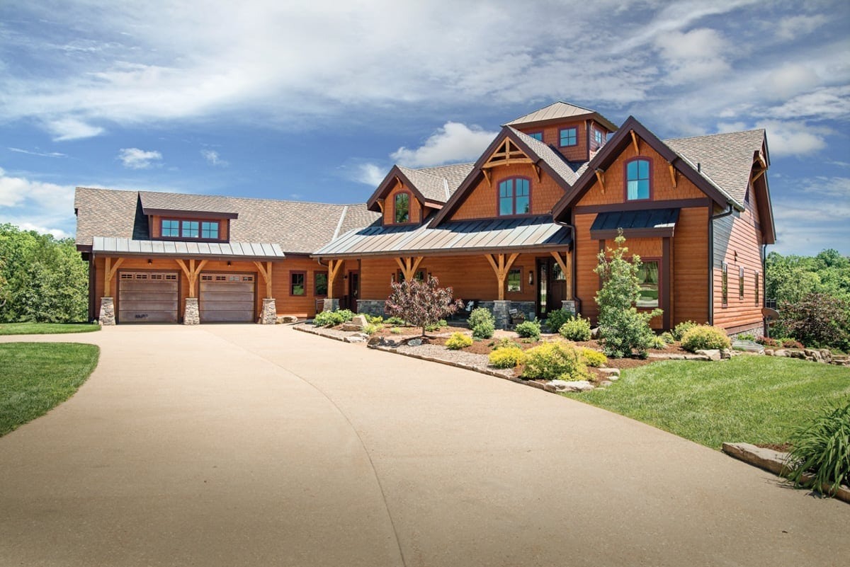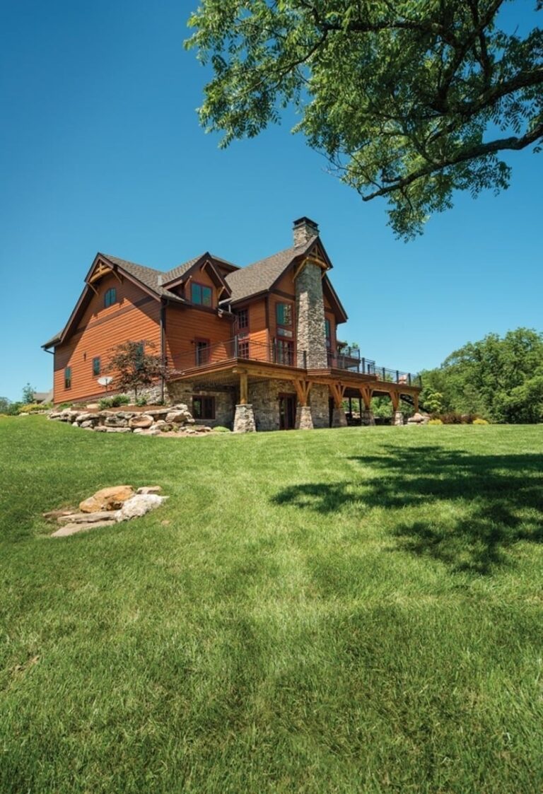 This Missouri ranch home is a great example of how the design of the timber frame itself can complement the overall design. A custom truss with a slight bow across the bottom was designed specifically for this home and is repeated throughout its interior and exterior. This bow is elegantly repeated in the windows located just below the trusses. Additionally, the bow is repeated in the eaves on the exterior elevations and also in the great room, where the window groups on each side of the fireplace curve perfectly with the timber above.
